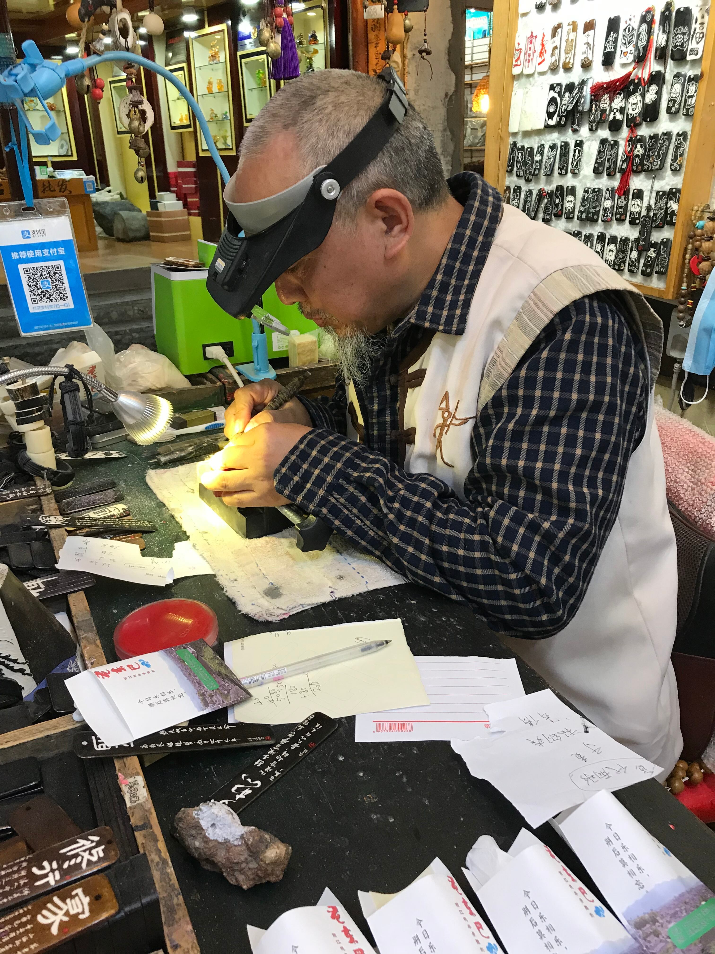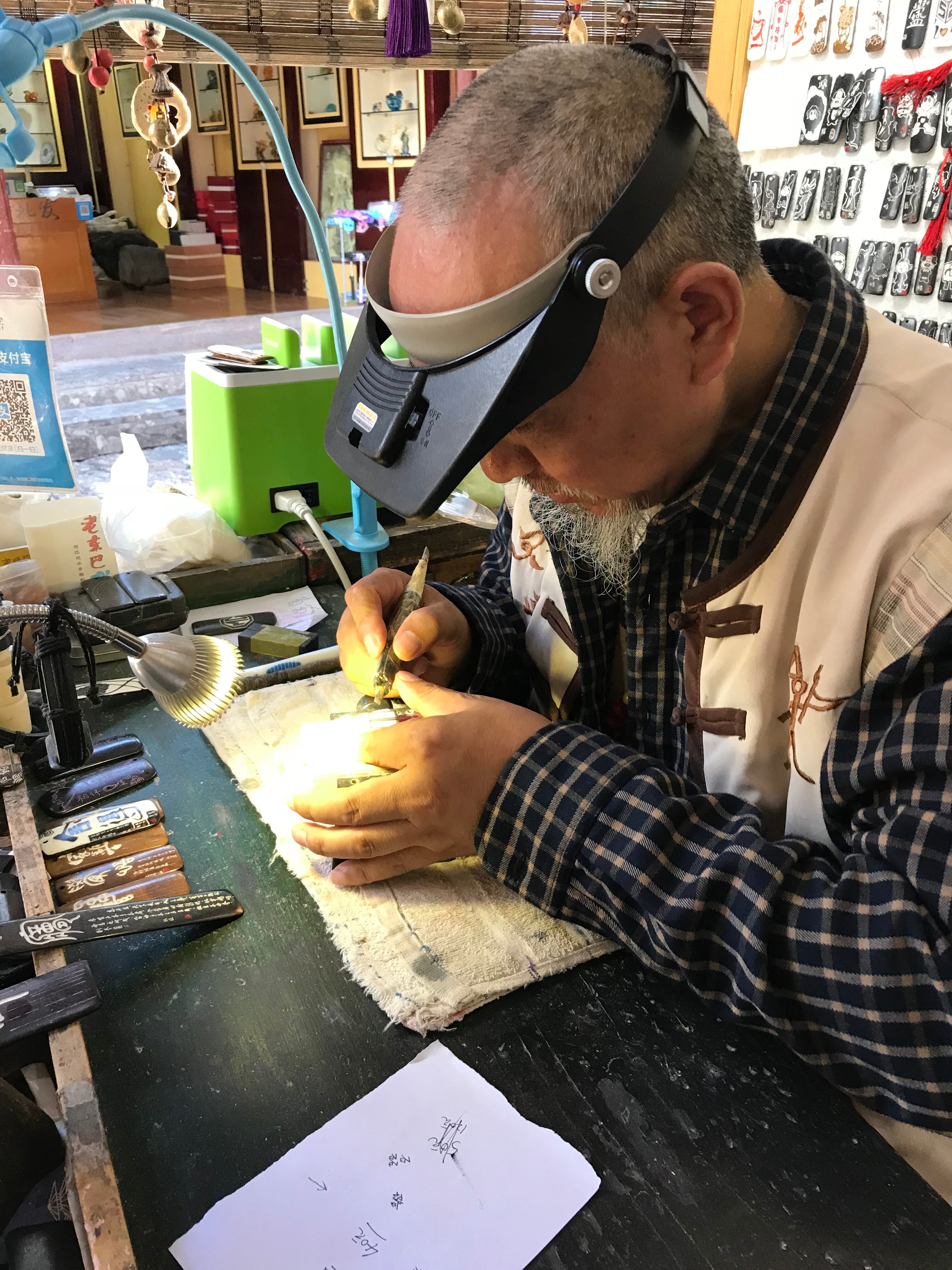 トンパ文字(象形文字)が現在も使われていると知って、どうしてもこの眼で見たくて訪れました。街全体を探しても私はこの方しか彫り師を見つけられず…本当に素敵で優しいお人柄で、お人そのものの、優しいハンコを作っていただきました。